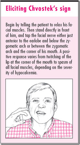 The chvostek sign is a clinical sign of existing nerve hyperexcitability (tetany) seen in hypocalcemia. #trousseau's to elicit the sign, a blood pressure cuff is placed around the arm and inflated the wrist and metacarpophalangeal joints flex, the dip and pip joints extend, and the fingers adduct. Positive chvostek's sign and trousseau's sign. Both chvostek's sign and trousseau's sign are timehonored physical predictors that are well 1 hypocalcemia is caused by a number of clinical entities and often presents with signs of generalized neuromuscular irritability including paresthesia, muscle cramps, laryngospasm, tetany, and seizures.